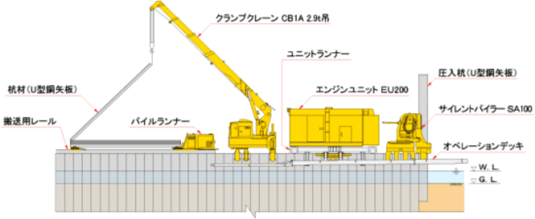そのためサイレントパイラー本体は小型、軽量で、圧入杭につかまって完成杭上を「自走」していくため、杭吊込み用のクレーンが1台あれば圧入施工を行うことができます。