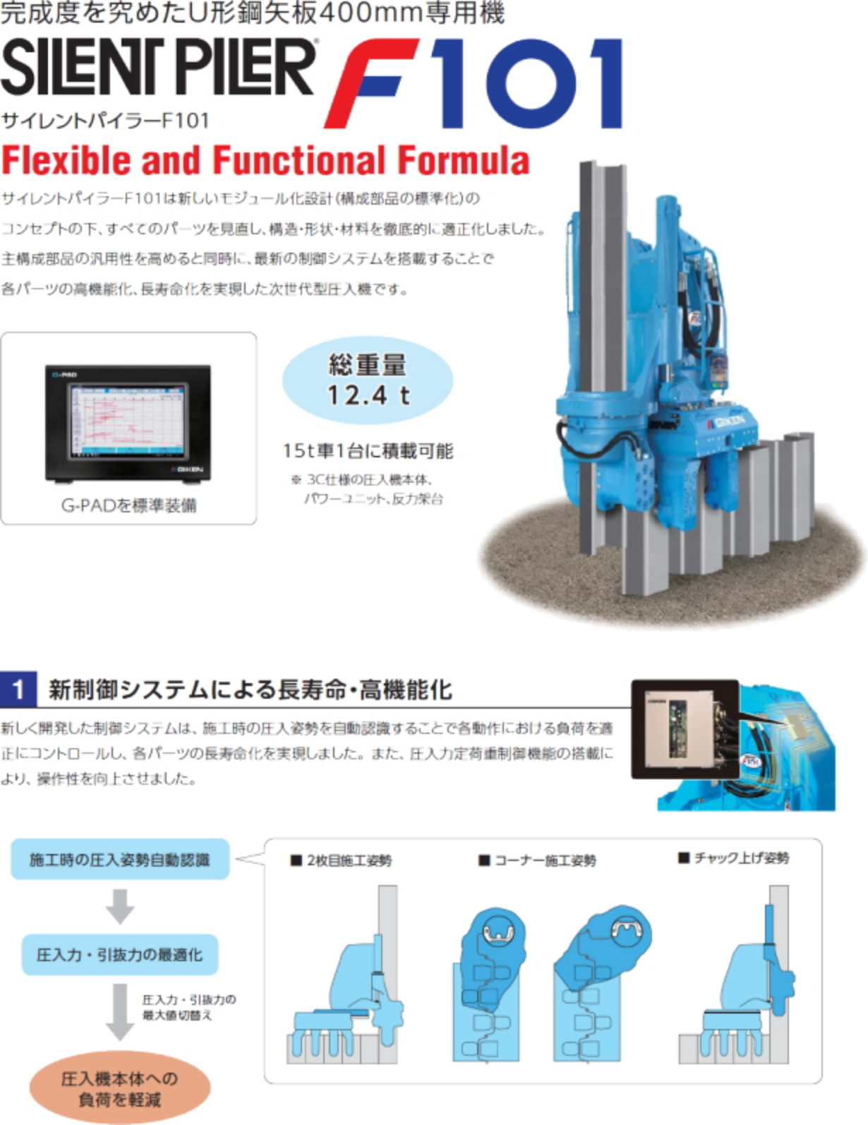 完成杭の引抜抵抗力を反力とし、次の杭に静荷重を加えて地中に押し込んでいく独創的な「圧入原理」を、 世界で最初に実用化した無振動・無騒音・無削孔施工の「油圧式杭圧入引抜機」です。